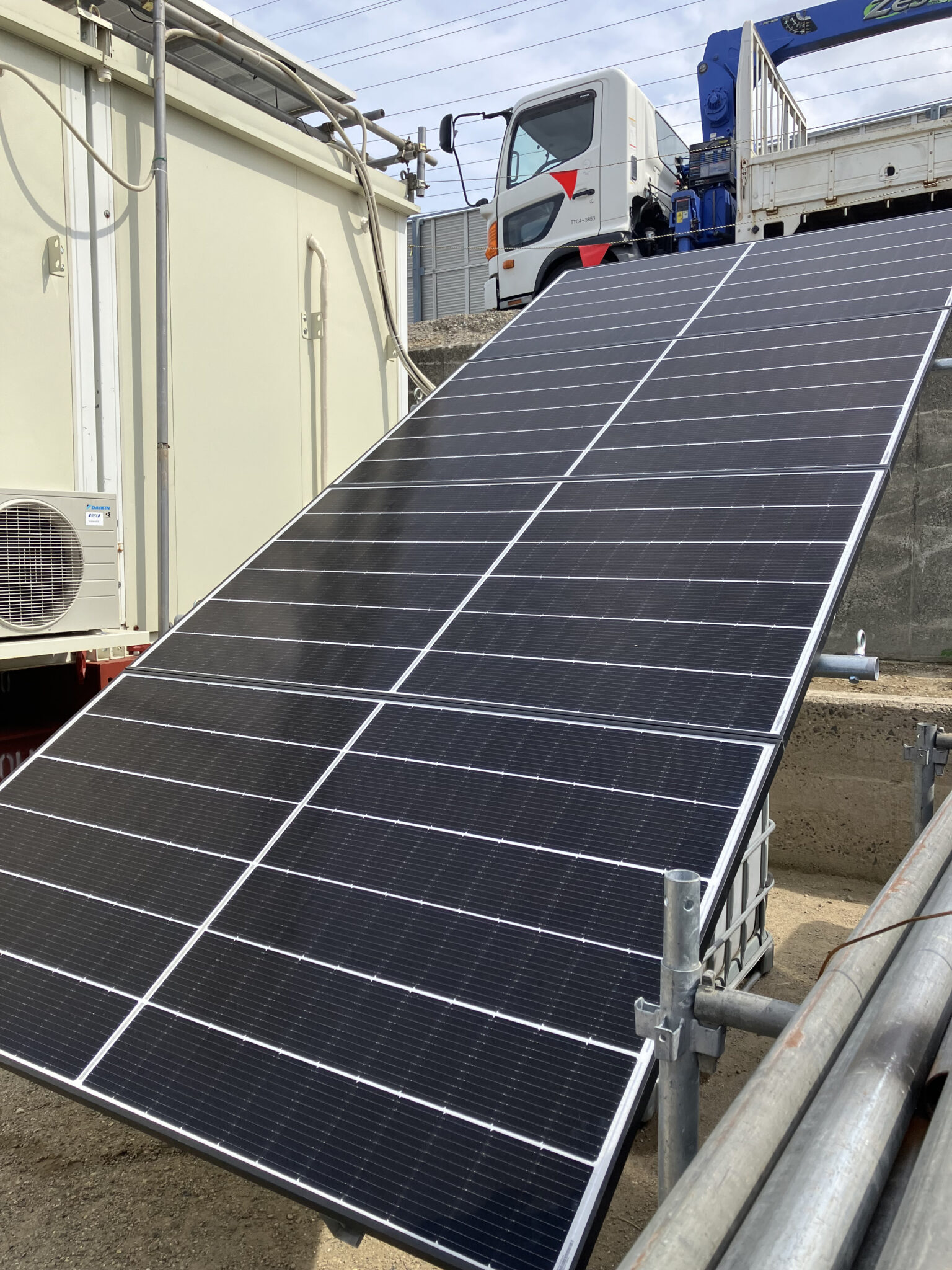 いつも仮設トイレを借りてくれる会社様からの要望で、「電気が引けないところに事務所を置くことになって、ずっと発電機を使用するのではなくソーラーパネルを使用したい」という話から始まりました。